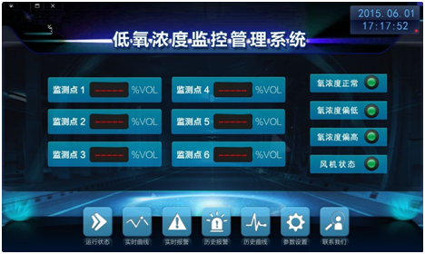 直接點(diǎn)擊-低氧濃度監(jiān)控管路系統(tǒng)-按鈕進(jìn)如;該界面 上可查看到系統(tǒng)運(yùn)行實(shí)際狀態(tài)并儲(chǔ)存、打印報(bào)警記錄。